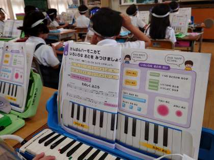 鍵盤ハーモニカを弾いて、いろんな音を探します。素敵な音と歌声が聞こえています。