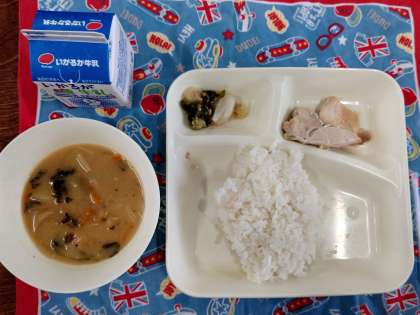 献立は、鶏肉のおろしじょうゆかけ、みそ汁、野菜いためです。