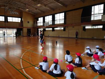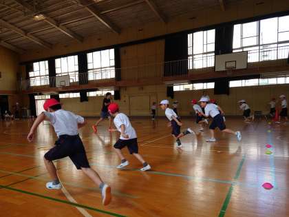 音楽に合わせて動きづくりをしたあと、まっすぐ走る練習をしました。
