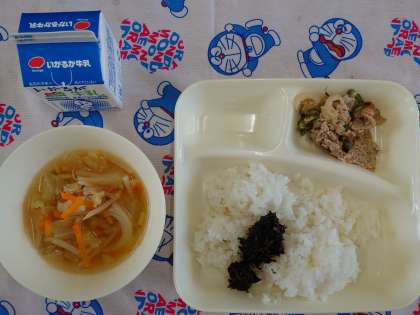 献立は、豚肉のごまみそ焼き、すまし汁、のりのつくだ煮です。