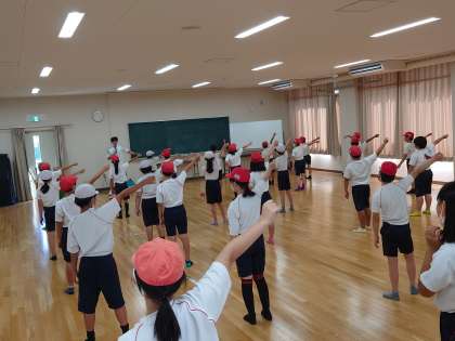 午後からグッと暑さが増してきたので、交流スペースで団体演技の練習です。