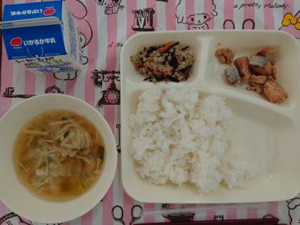 今日の献立は、さけのつけ焼き、五目汁、高野どうふのいり煮です。
