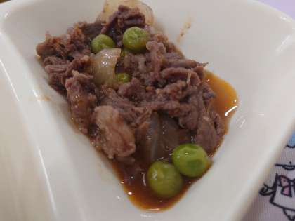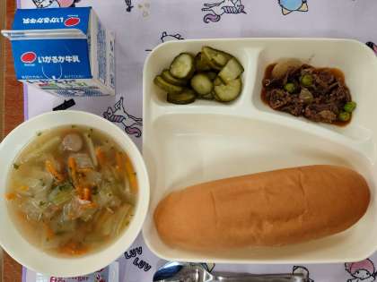 献立は、牛肉のデミグラスソース煮、スープ、きゅうりのピクルスです。