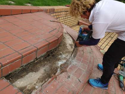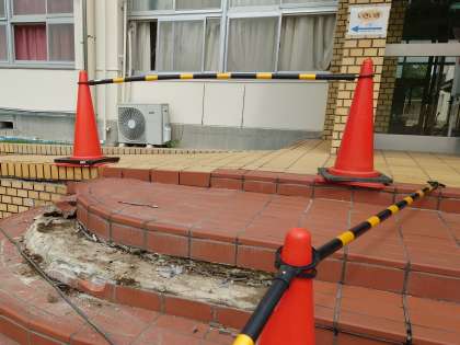 本校玄関前階段の一部のタイルに剥がれが見られましたので、急遽張替え工事を行っています。