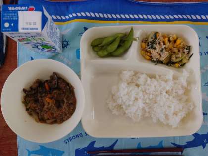 献立は、マーボーなす、チンゲンサイとコーンのいためもの、えだまめです。