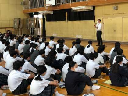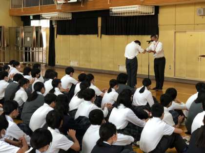 本日、朝、中学校集会を行いました。「大阪市将棋大会」の表彰に続き、副校長先生より、優しさの練習のお話がありました。