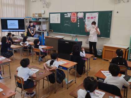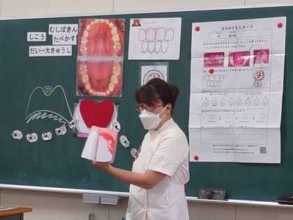 歯科衛生士さんから歯みがきについての授業を受けています。