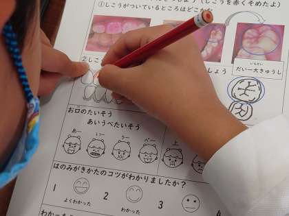おやつを食べるときの注意や歯垢のつきやすい所、歯のみがき方などを教えていただきます。