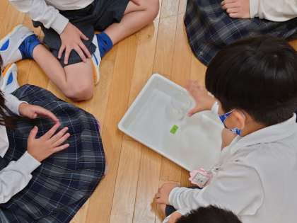 コップの水がなくなるマジックに、1年生は大興奮です!
