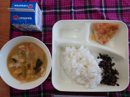 献立は、あかうおのみぞれかけ、みそ汁、牛ひじきそぼろです。