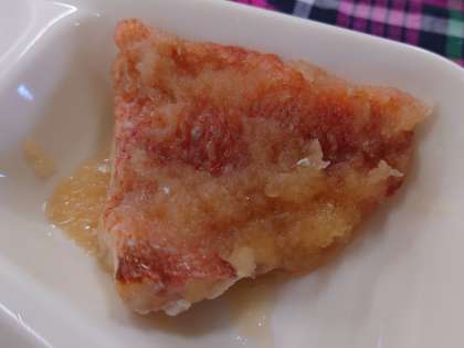 「あかうお」は、その名の通り体が赤い魚の総称で、アコウダイやアラスカメヌケなどの魚が一般的だそうです。柔らかくて、くせのない味で、とてもおいしい魚です。今日は、焼いたあかうおに大根おろしのみぞれだれがかかっています。