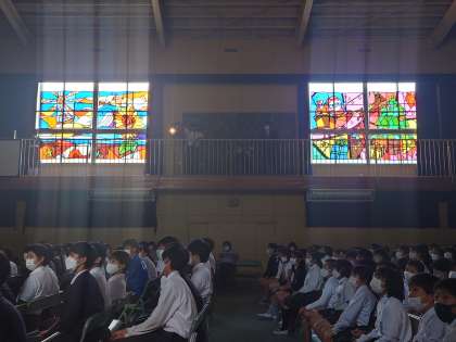 9年の劇では、殺陣や合奏、ダンスなどに加え、体育館のギャラリーにはステンドグラスが!