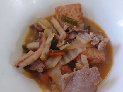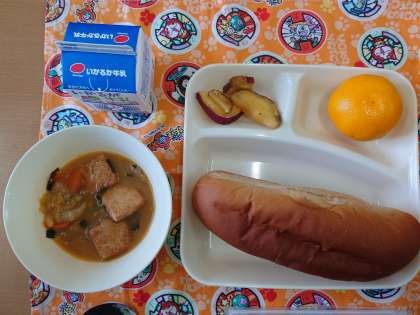 献立は、豚肉といかの中華煮、大学いも、みかんです。