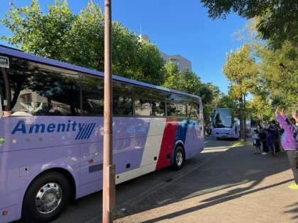たくさんの保護者、教職員に見送られ、出発です!