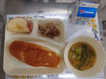 献立は、豚肉のオイスターソース焼き、中華みそスープ、りんごです。