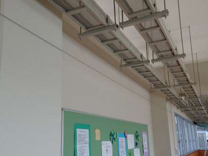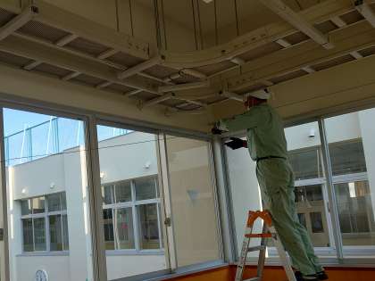 新校舎の学習スペースで、管理作業員さんがワイヤーを張る作業を進めてくださっています。