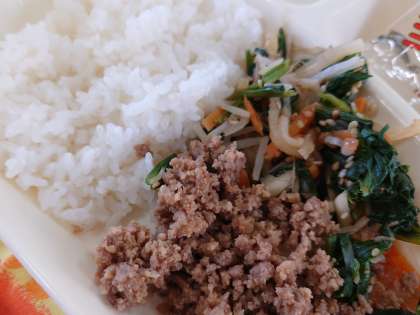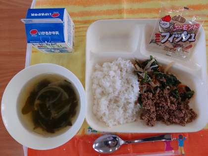 献立は、ビビンバ、わかめスープ、アーモンドフィッシュです。