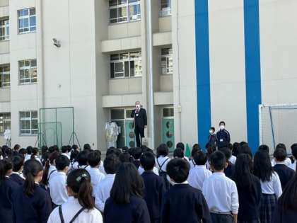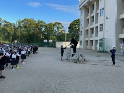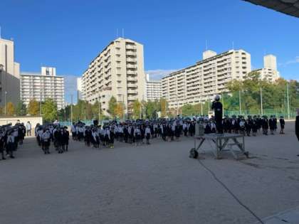 少し肌寒さを感じる中、小学校朝会が行われました。