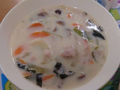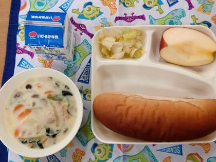 きのこは、骨の形成を助けるビタミンDや食物繊維が豊富なほか、旨味成分も多く含んでいるそうです。今日のクリームシチューには、しめじ、エリンギ、マッシュルームが入っています。ほっこり温まるメニューですね。