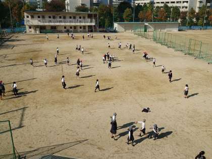 まだ少し風は冷たいですが、雲ひとつない秋晴れのもと、子どもたちが元気いっぱい体を動かして遊んでいます!