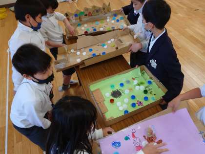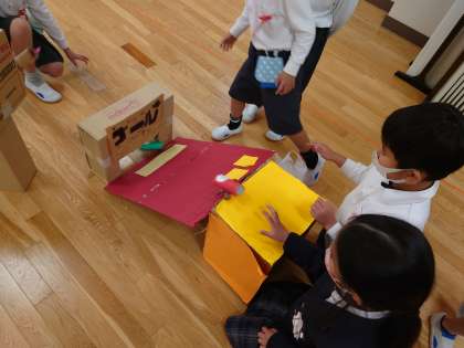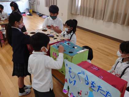 工夫をこらしたお店を開き、お客さんに楽しんでもらいます。どのお店も「どんぐり」を使っています。楽しいゲームばかりで盛り上がりました。ルールの説明をしたり時間を計ったり、役割を分担してがんばりました!