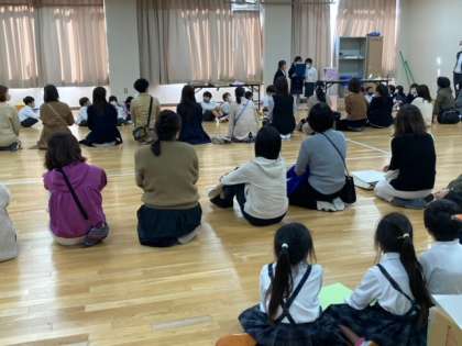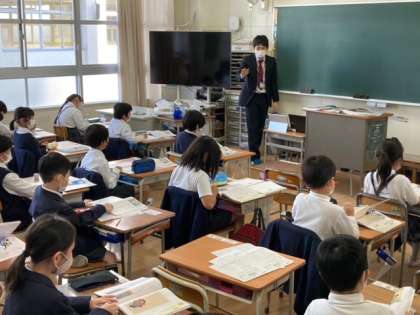 1年生は交流スペースで発表を、3年生は教室で、5年生は運動場での授業を行いました。