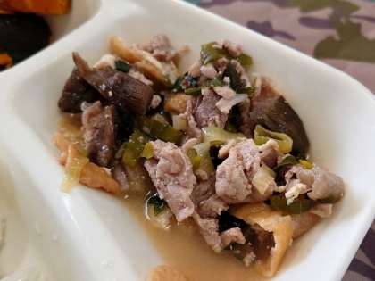 豚肉と干しずいきのみそ煮、うすくず汁、焼きかぼちゃの甘みつかけです。