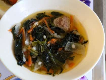 今日のスープには、押し麦が入っています。押し麦は、大麦をつぷして平らにしたものです。食物繊維が豊富で、カルシウムや鉄分、ビタミンB1、B2も多く含まれています。食物繊維は、腸内の善玉菌を増やし、腸の働きを活発にします。元気な腸は元気のもとです。しっかり食べましょう!