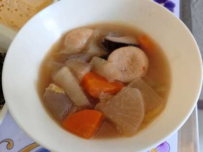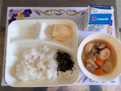 がんも(がんもどき)は、水気をしぼった豆腐に細かく切った野菜を混ぜ合わせて丸く成型し、油で揚げたものです。もともとは、「雁(がん)」という鳥の肉に味を似せて作られたのが始まりだそうです。今日の給食では、一口サイズのものを使っています。お出汁を吸って、とてもおいしく煮てあります。