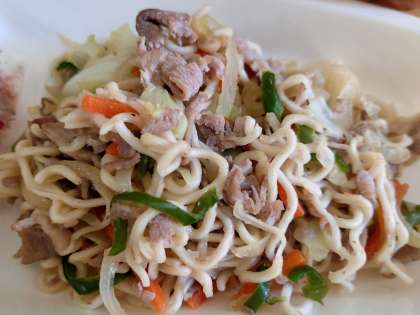 和風焼きそばは、豚肉をメイン具材に、塩、こしょう、うすくちしょうゆ、こいくちしょうゆで味付けし、かつおぶしをかけていただきます。あっさりしていて、とてもおいしいです。