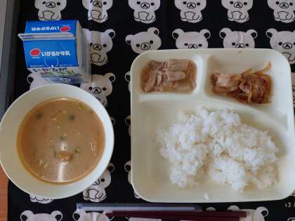 献立は、鶏肉の甘辛焼き、みそ汁、だいこんの煮ものです。