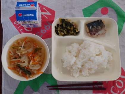 さばは、背中が青いことから、魚へんに青いと書いて「鯖」です。さばには、体をつくるたんぱく質や、血をサラサラにするEPAと頭の働きをよくするDHAが多く含まれています。特にDHAは魚にしか含まれない成分です。今日は、みぞれかけの大根おろしで、さっぱりおいしくいただけます。魚が苦手という人もいると思いますが、まずは一口!