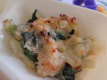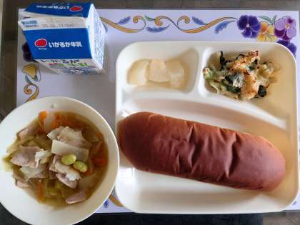 献立は、ほたて貝のグラタン、スープ、和なし(カット缶)です。