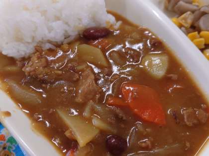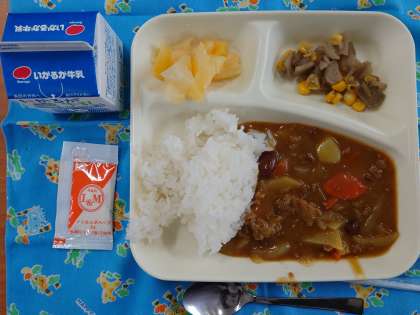 献立は、牛肉と金時豆のカレーライス、ごぼうサラダ、パインアップル(カット缶)です。