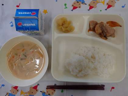 献立は、鶏肉の甘辛焼き、かす汁、くりきんとんです。