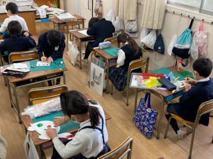 2年生の図工では、ステンドグラスの基本となる作品を制作中です。カッターナイフを丁寧に使っていました。