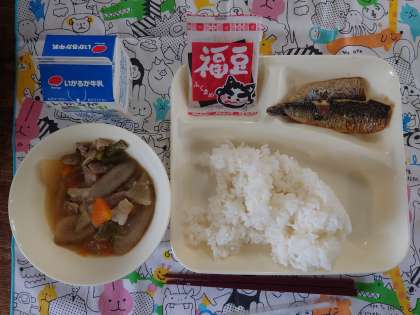 今日は節分の行事献立です。節分と言えば豆まきを思い浮かべると思いますが、地方によっては恵方巻やいわしを食べる習慣もあります。いわしを食べる理由は、邪気(悪い気)を追い払うためと言われています。いわしには、タウリンやDHA、カルシウムなどの栄養が豊富に含まれており、病気の予防にも効果的です。いわしを食べて、邪気を払いましょう!