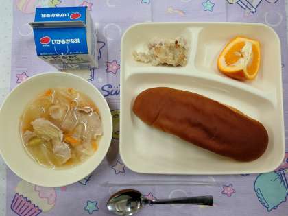 献立は、押麦のグラタン、豚肉と野菜のスープ、いよかんです。
