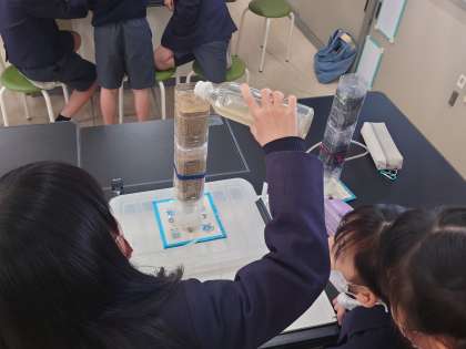 ペットボトルと砂を使った浄水装置を作って、淀川の水をきれいにします。にごった水が透明になって出てくる様子に、大きな歓声があがっています。