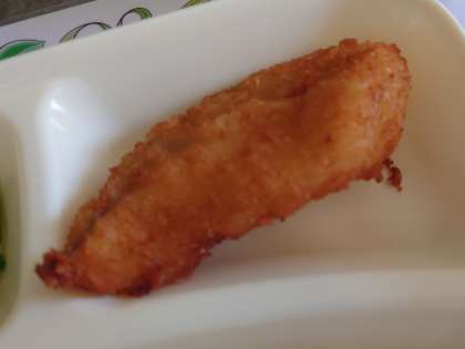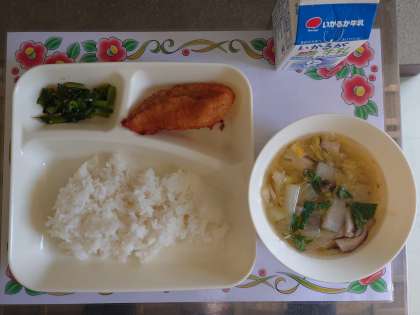 献立は、たらフライ、すまし汁、こまつなのごまあえです。