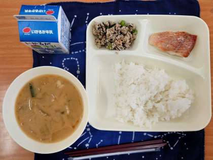献立は、あかうおのレモンじょうゆかけ、みそ汁、高野どうふのいり煮です。