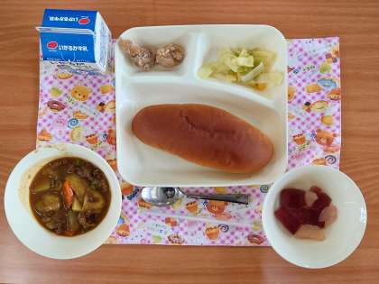 献立は、フライドチキン、カレーシチュー(米粉)、キャベツとコーンのサラダ、フルーツゼリーです。