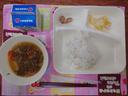献立は、肉じゃが、はくさいのゆず風味、とら豆の煮物です。