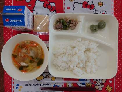 献立は、豚肉と野菜のいためもの、すまし汁、きな粉よもぎだんごです。