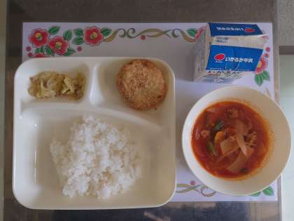 献立は、チキンレバーカツ、ケチャップ煮、ツナとキャベツのバジルソテーです。