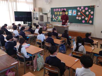 みんなきちんと自分の席に座って、お話を聞くことができています。