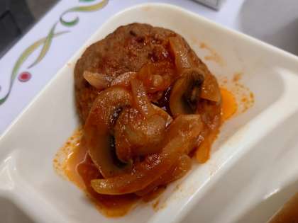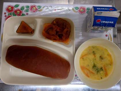 献立は、煮こみハンバーグ、コーンとキャベツのスープ、焼きかぼちゃです。