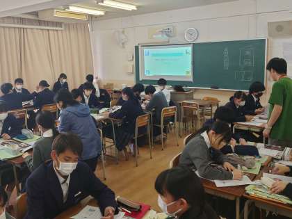 まずは、これまでの学習を振り返ります。班で協力して考えています。
