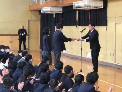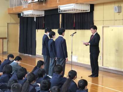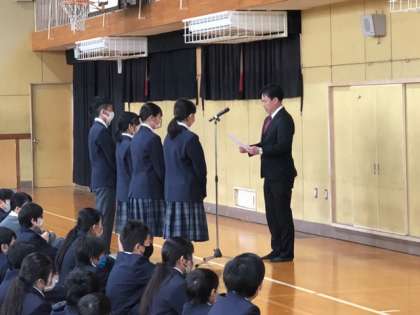 英検、テニス部の表彰に続き、各委員会の認証式がありました。