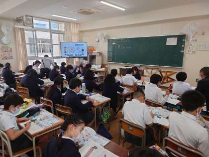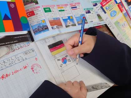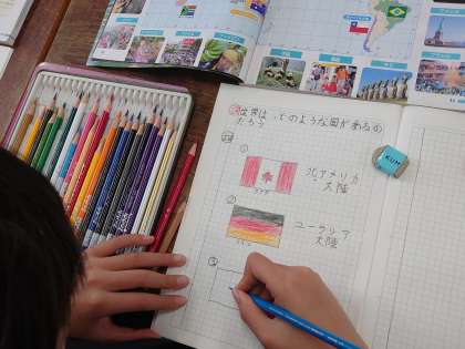 世界地図を開き、世界にはどんな国があるかを調べ、国旗を描きます。